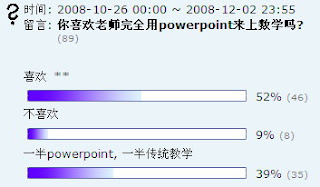于是今年上高一數學完全用ppt教課, 也做得差不多了, 越做越精熟, 技術也進步了。有時會和同事分享, 鼓勵他們學, 但因為他們怕辛苦, 又不願意花時間學, 有些比較不客氣的就直接跟你要, 不是不給, 而是自己花了那么大的心思和時間, 一個 pendrive 過來, 一句 "save", 就拿過去了, 心里感到不舒服, 但能說不嗎? 有的要了沒關係還把自己的名字寫在課件后頁, 并標榜自己制作的, 看了更心痛。